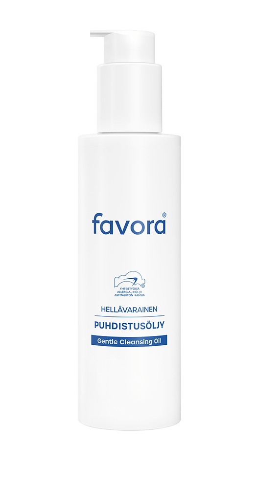 Hellävarainen puhdistusöljy – Tehokas ja kosteuttava Favora Hellävarainen Puhdistusöljy puhdistaa ihon ja poistaa meikin tehokkaasti ihoa kuivattamatta. Kauraöljyä sisältävä koostumus jättää ihon pehmeäksi ja kosteutetuksi. Sopii herkälle iholle ja on kehitetty yhteistyössä Allergia-, iho- ja astmaliiton kanssa. Tehokas ja hellävarainen puhdistus Kauraöljy hoitaa ja kosteuttaa Hajusteeton ja väriaineeton Vegaaninen ja eläinkokeeton Valmistettu Suomessa – Avainlippu-tuote Käyttöohje: Hiero kuivalle iholle pyörivin liikkein. Huuhtele vedellä tai poista kostealla puhdistussienellä tai -liinalla. Viimeistele miselli- tai kasvovedellä. Tilaa nyt ja koe kosteuttava puhdistuselämys!