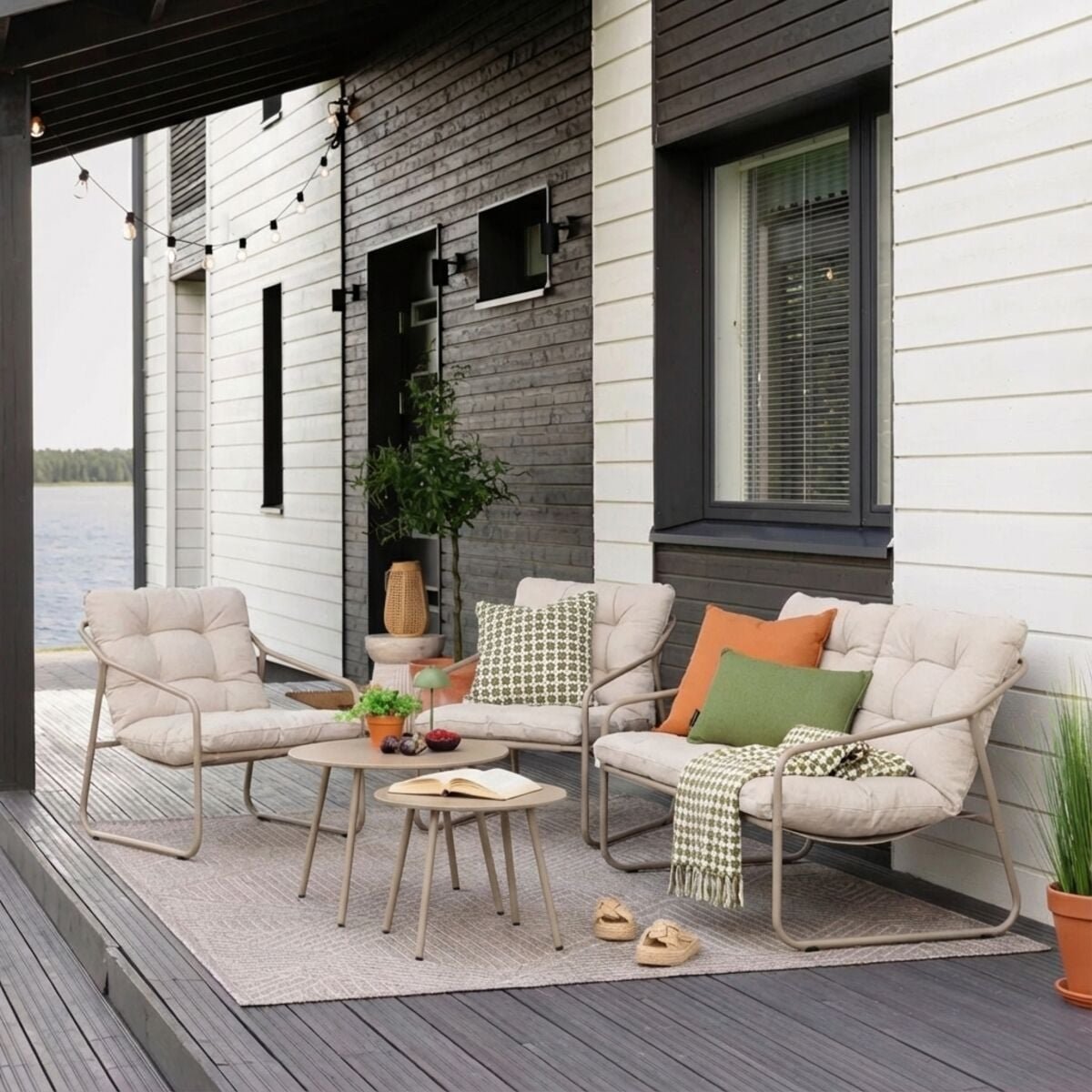 House Nordic Nilo-sohvaryhmä on kuin kutsu istahtaa alas ja unohtaa kiire. Kevytlinjainen teräsrunko tuo kalusteisiin ilmavuutta, ja paksut, muhkeat pehmusteet tekevät istumisesta rennon mukavaa. Nilon ilme on rauhallinen ja kutsuva, juuri sellainen, joka sopii monenlaiseen kotiin ja ulkotilaan. Kokonaisuuteen kuuluu 2-istuttava sohva, kaksi nojatuolia sekä käytännöllinen sarjapöytä, jolle mahtuu kahvikupit, kirja ja pienet herkut. Nilo toimii mainiosti katetulla terassilla tai parvekkeella, jossa haluat viettää aikaa yksin, yhdessä tai ihan vain olla. Nilo-sohvaryhmä tekee ulkotilasta paikan, johon tekee mieli palata kerta toisensa jälkeen.