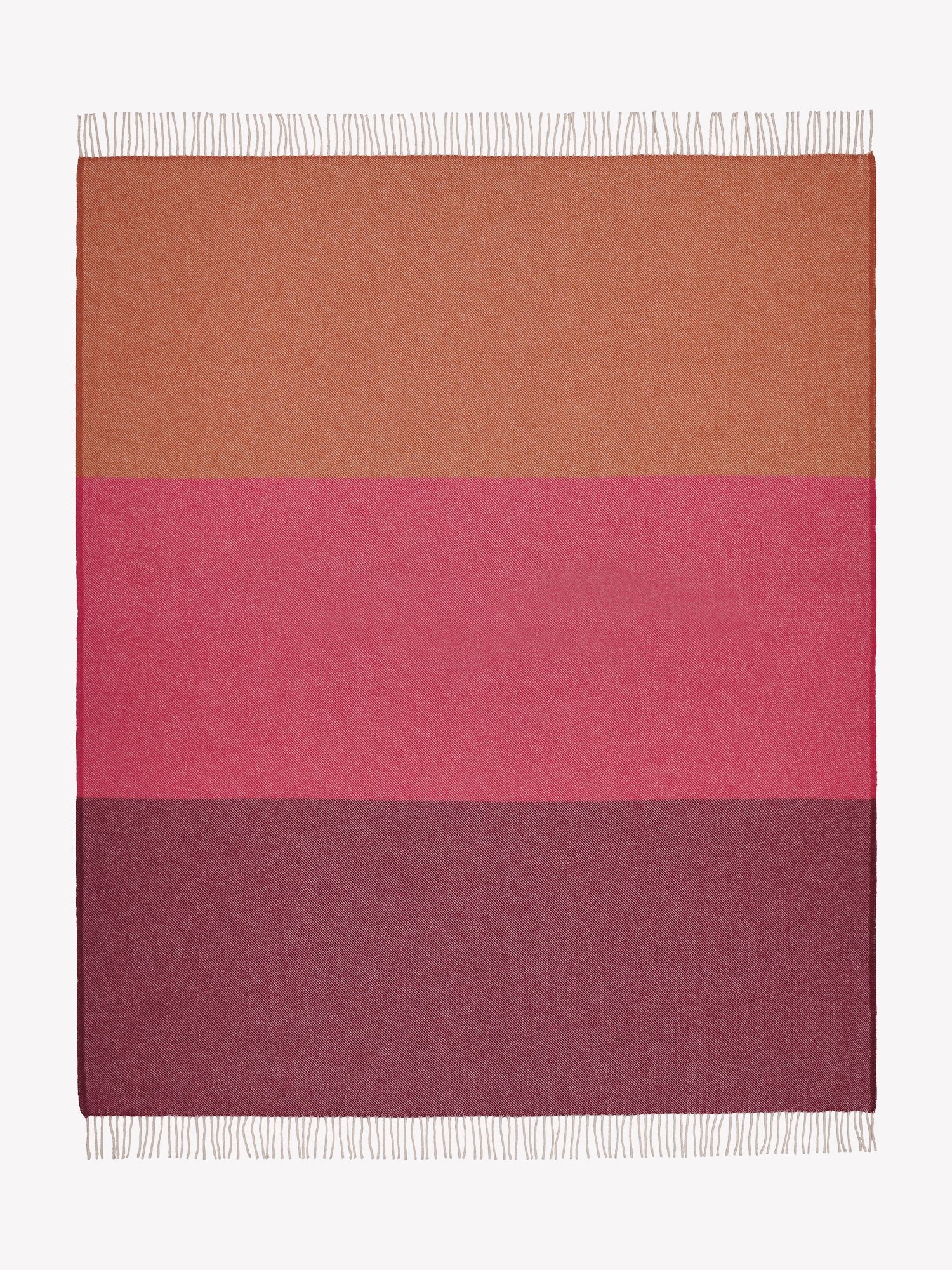 Kylmenevinä iltoina on ihanaa kietoutua 100% uudesta, puhtaasta villasta valmistettuun Trio-villahuopaan. Huovassa on kaunis punainen raitakuvio. Villahuovan lyhyitä sivuja koristaa kierrehapsut ja vasemmassa alakulmassa on kudottu Nanso-merkki. Huovan koko on 130 x 170 cm.