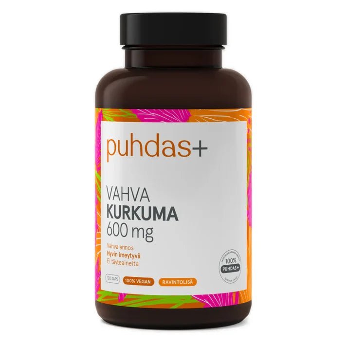 Puhdas+ Kurkuma & Mustapippuri on vahva ja tehokas ravintolisä, joka sisältää 600 mg korkealaatuista kurkumaa ja 5 mg mustapippuriuutetta yhdessä kapselissa. Mustapippuriuute (piperine) edistää kurkuman vaikuttavien aineiden, erityisesti kurkumiinin, imeytymistä elimistössä jopa moninkertaisesti. Tuote on suunniteltu tukemaan kehon normaalia vastustuskykyä, nivelten hyvinvointia sekä yleistä hyvinvointia. Puhdas+ -ravintolisät valmistetaan ilman keinotekoisia lisäaineita – ei säilöntä-, väri- tai makuaineita. Annostus:Aikuisille 1 kapseli vuorokaudessa. Suositeltua vuorokausiannosta ei saa ylittää. Ravintosisältö / 1 kapseli: Kurkuma 600 mg Mustapippuriuute 5 mg Ei korvaa monipuolista ja tasapainoista ruokavaliota tai terveellisiä elämäntapoja. Ei lasten ulottuville.