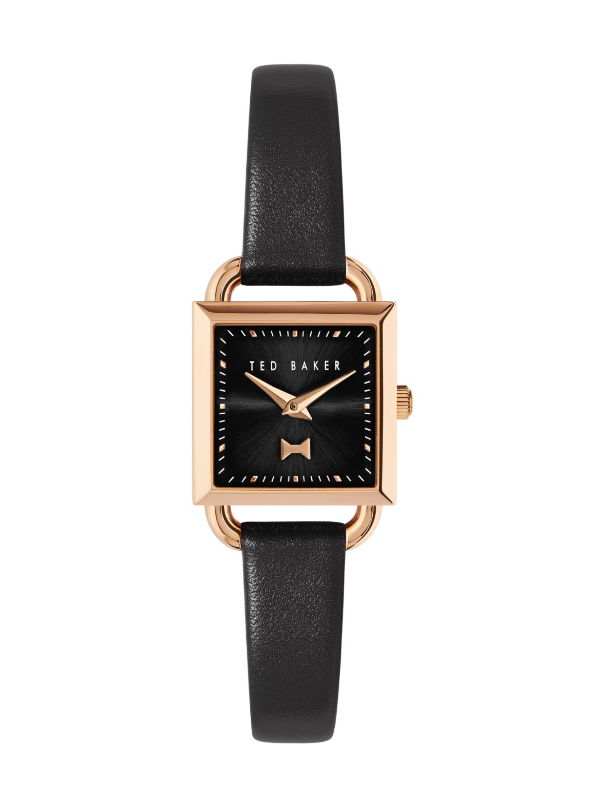 Ted baker taliah bow-mallisto on naisellisen elegantti ja neliskanttinen muoto erottuu joukosta. Kellon ruusukullanvärinen runko on valmistettu ruostumattomasta teräksestä ja sen leveys on 24mm ja paksuus on 7mm. Kellossa on musta nahkaranneke. Kellon taulu on musta, jossa on ruusukullanvärinen rusetti yksityiskohtana. Kellossa on mineraalilasi ja kvartsikoneisto. Kellon vesitiiviys on 5atm. Ted baker kelloilla on 2 vuoden takuu.