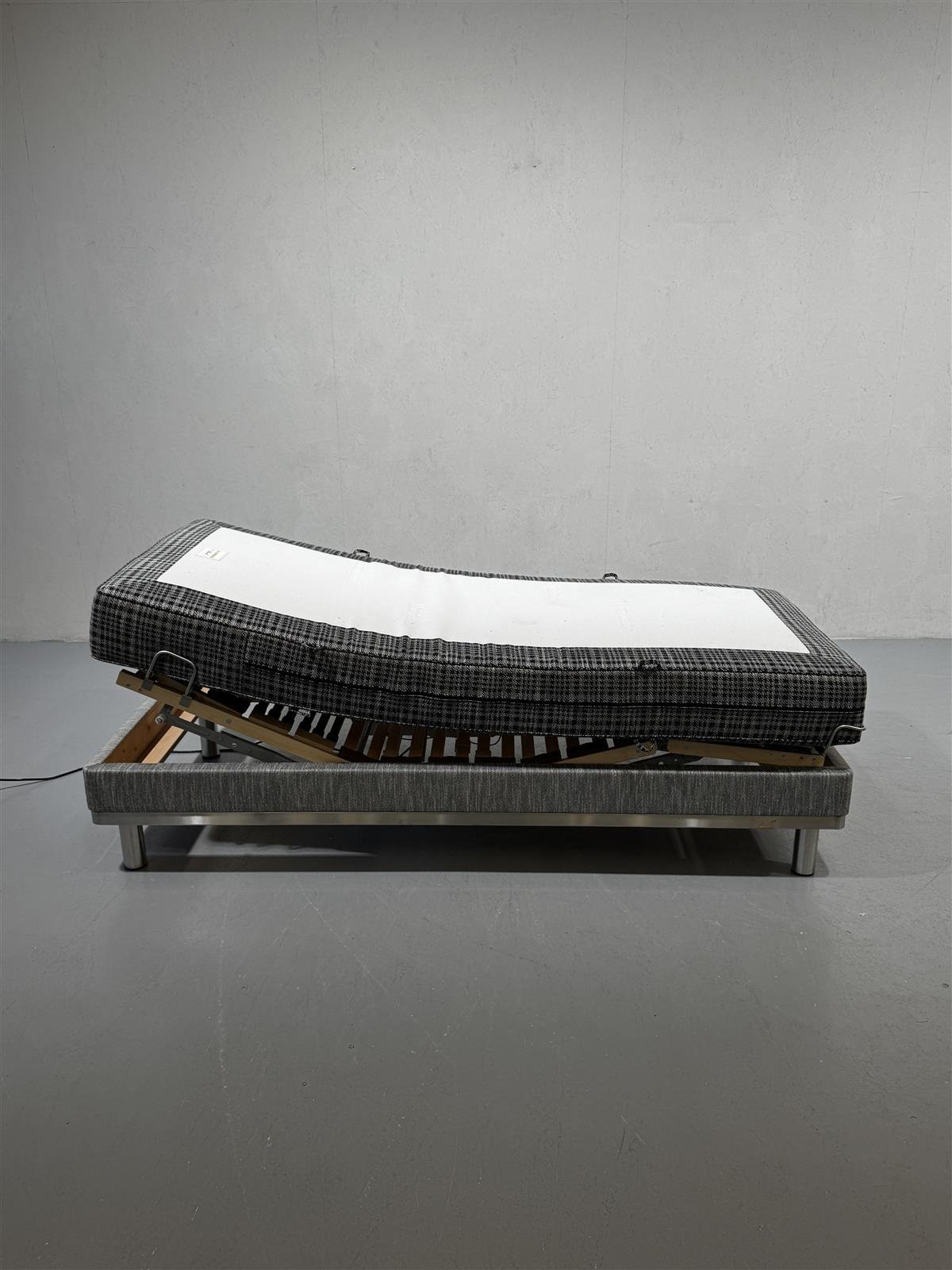 Moottoroitu sänky, jossa on säädettävä runko ja kaukosäädin. Sängyn verhoilu on harmaasävyistä kuviollista kangasta, ja siinä on metallijalat. Design Pauli Jämsen.Yleiskunto siisti ja toimiva