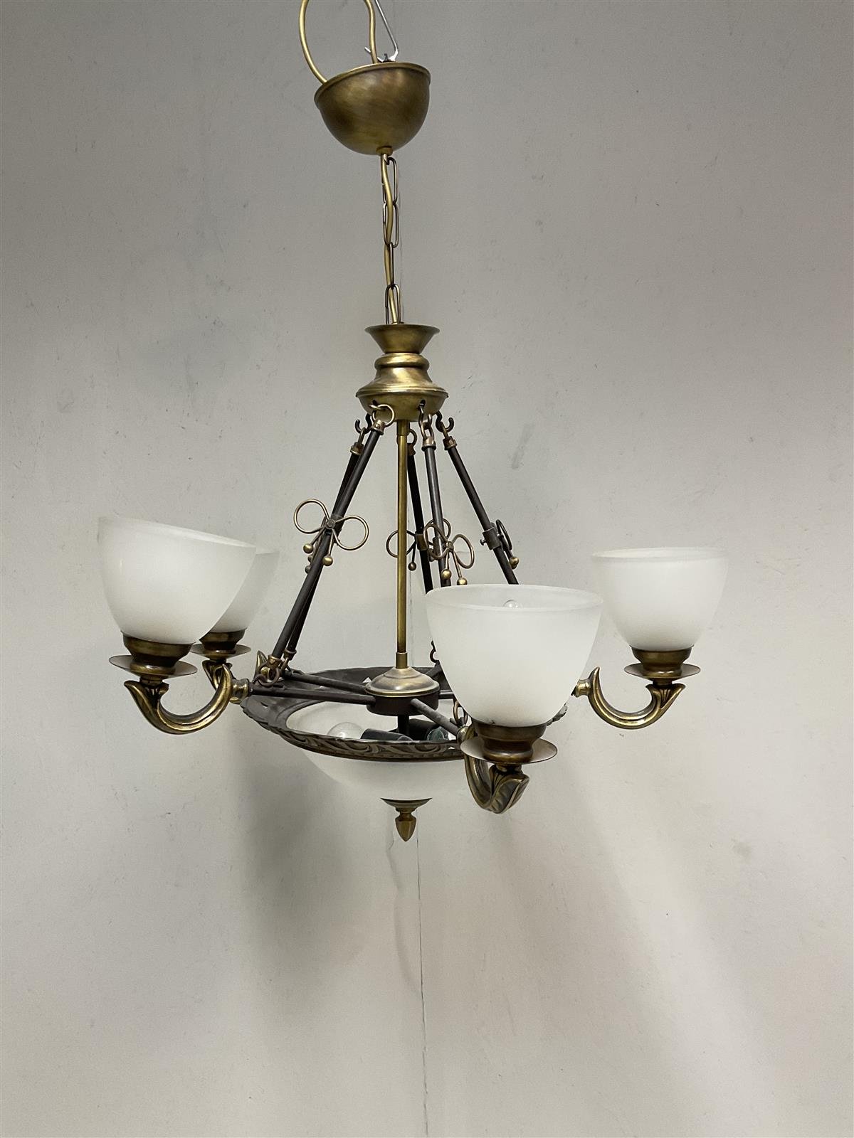 Vintage kattokruunu, jossa on metallinen runko ja lasiset ylöspäinsuuntaavat varjostimet. Valaisimessa on keskikuvussa kaksi volopistettä ja ympärillä viisi valopistettä, jotka luovat pehmeän valaistuksen tilaan. Metalliosat ovat hieman patinoituneet ajan myötä.